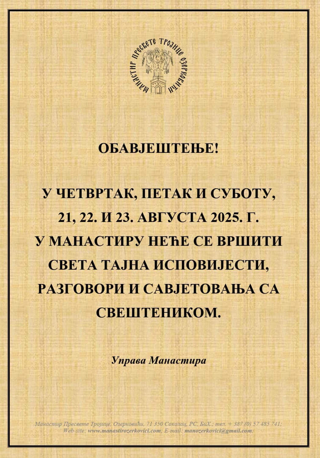 ОБАВЈЕШТЕЊЕ! У четвртак, петак и суботу, 21,22. и 23. августа 2025. г. у Манастиру неће се вршити Света тајна исповијести,…