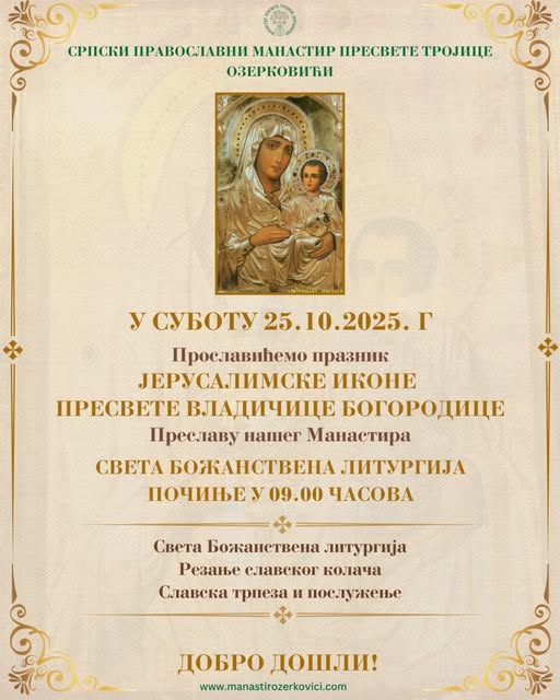 МАНАСТИР СВЕТЕ ТРОЈИЦЕ У ОЗЕРКОВИЋИМА ПРОСЛАВИО ПРАЗНИК ЈЕРУСАЛИМСКЕ ИКОНЕ БОГОРОДИЦЕ (2025) У суботу 25. октобра 2025. године прославили смо празник…